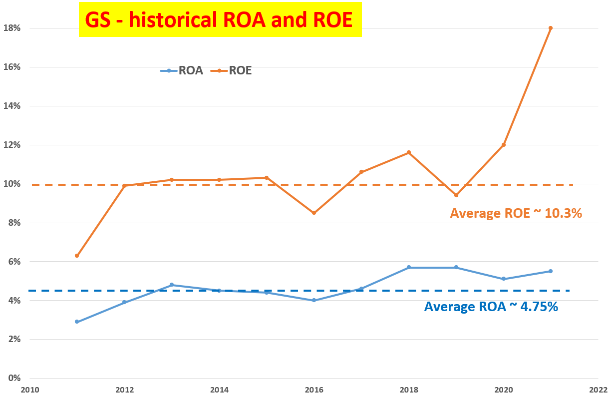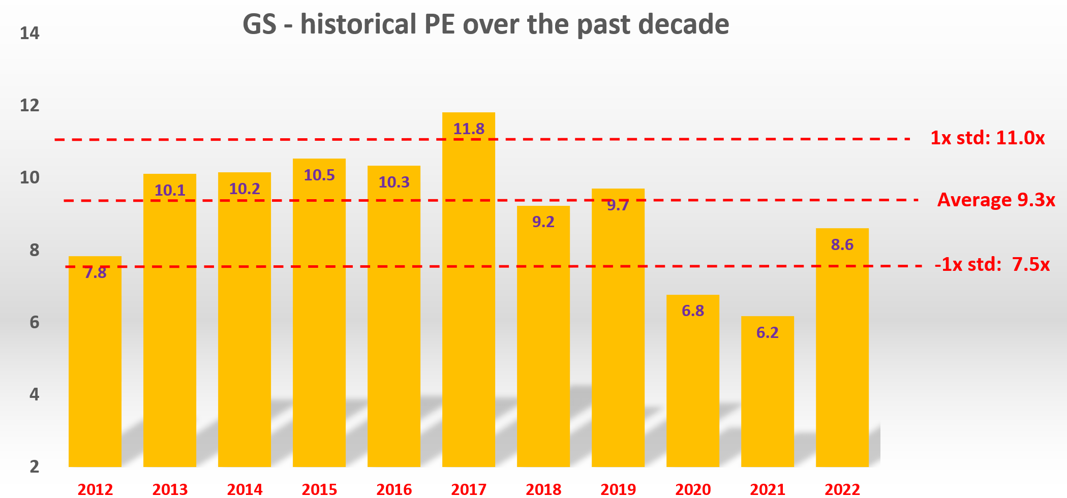 In particular, the recent price correction has brought its PE to be near its historical mean of 9.3x. The following chart shows the annual average PE of the stock in the past decade. You can see the cyclical nature given its business cycles. As seen, the average is 9.3x and the standard deviation is ~1.8 (also note the large volatility here). The current FW PE is about 8.6x, slightly below the historical average but within the 1-sigma variation. Obviously, there is no reason why the PE has to be around mean. But for a stable and well-established stock like GS, there is no reason to expect a sudden quantum leap in its valuation either. And a large part of being a conservative investor means to be aware of the rule of reverse selectivity – I am more inclined to expect something old to repeat itself again than to expect something completely new to show up.